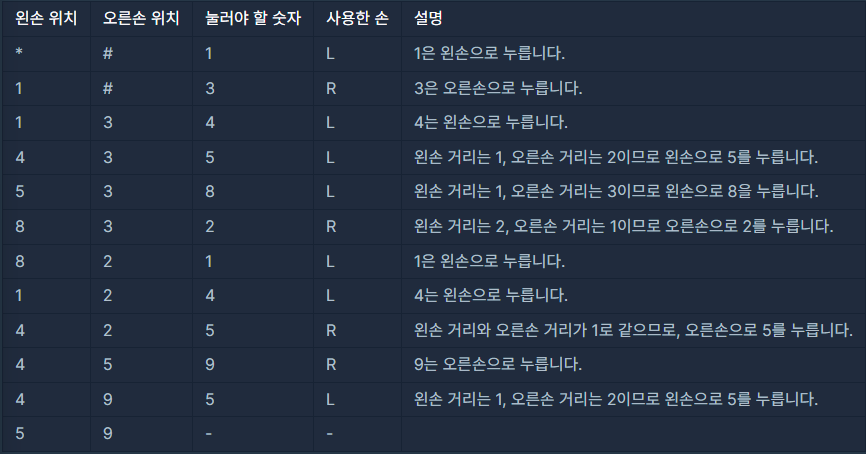 순서대로 눌러야 할 번호가 [1, 3, 4, 5, 8, 2, 1, 4, 5, 9, 5]이고, 오른손잡이입니다.