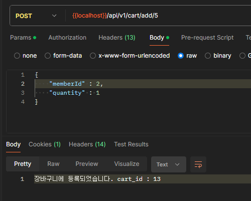 return ResponseEntity.ok("장바구니에 등록되었습니다. cart_id : " + createdId);
