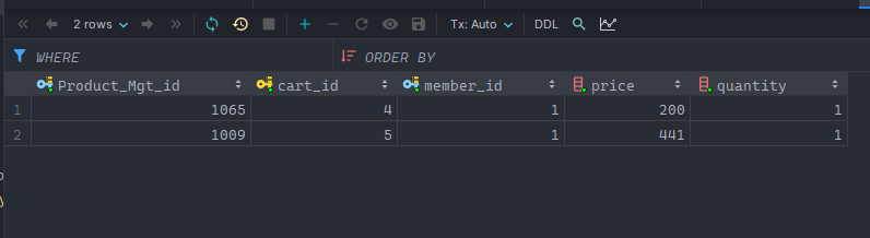 동일 사용자가 같은 상품/옵션을 선택했다면 수량과 가격을 올리고, 같은 상품/다른 옵션 또는 다른 상품을 선택했다면 장바구니에 따로 담는다. 이를 위해 상품 옵션 정보를 담은 상품 관리 테이블을 만들었던 것.