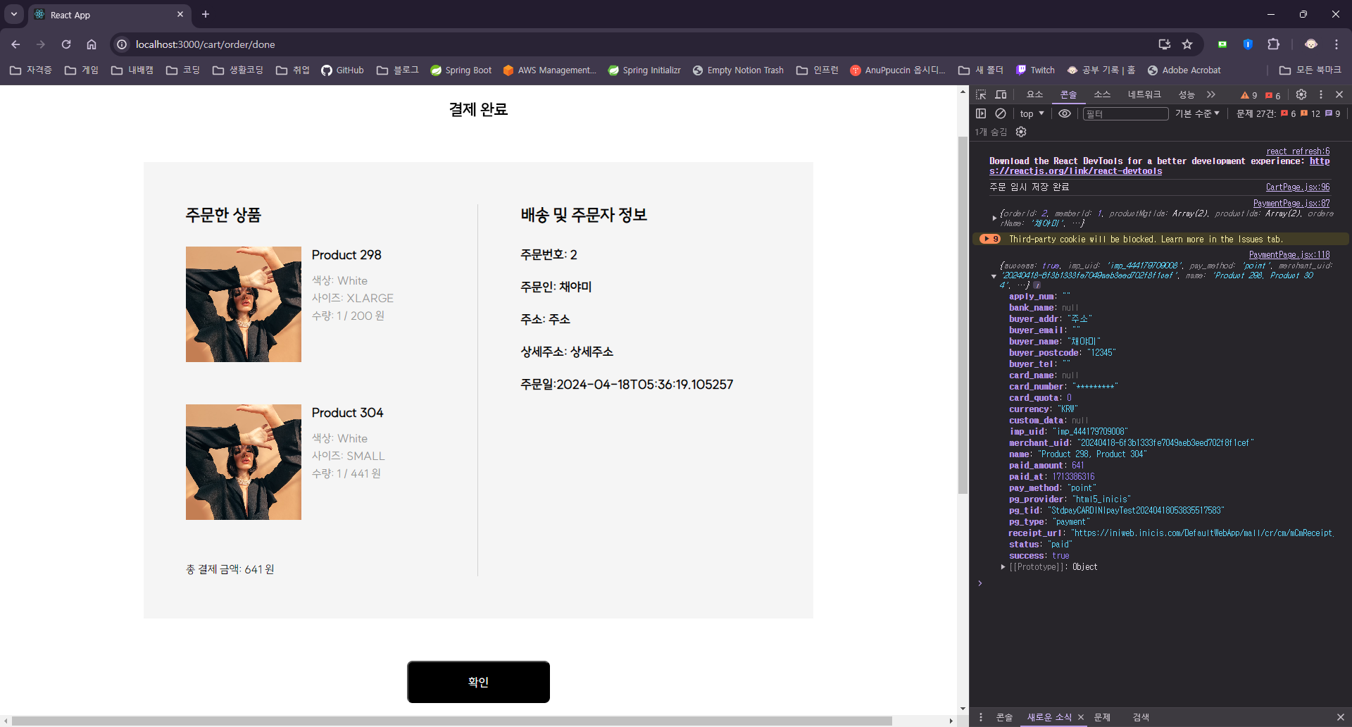 결제하기를 누르면 주문 테이블이 저장되고, 저장된 객체를 response로 받아 결제를 진행한다. 여기서 결제가 완료되면 서버에 있는 결제 API가 호출된다.