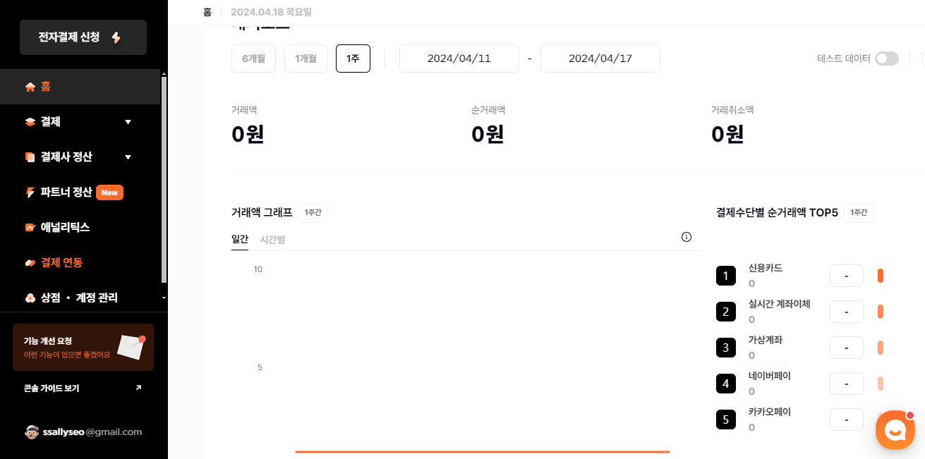 3. 테스트 결제를 연동할 거니까 테스트를 눌러주고,