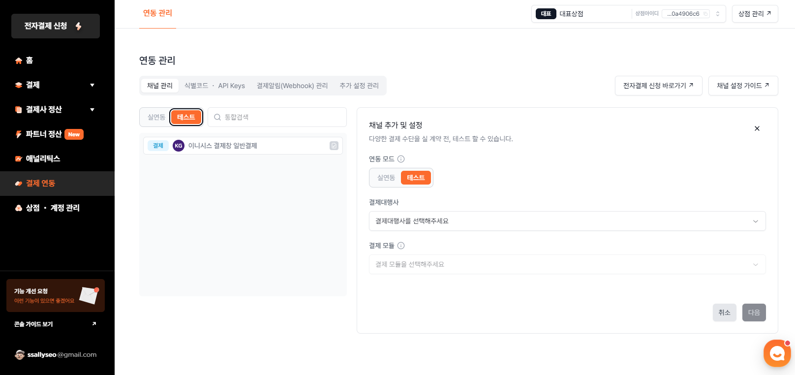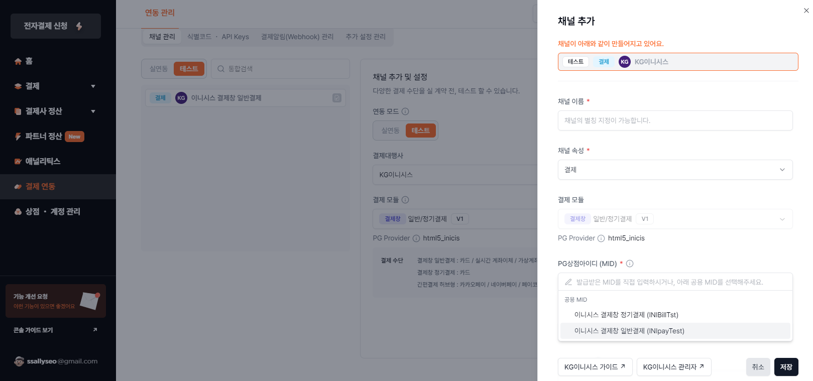 5. 결제 모듈과 MID를 선택하고 저장을 누르면 채널이 만들어진다.