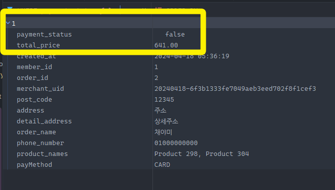 이때 주문 테이블은 정상적으로 저장된 것을 확인할 수 있고, 결제 상태는 아직 false이다.
