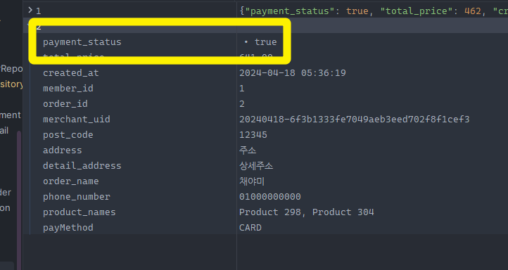 결제를 완료하면 결제 완료 페이지로 넘어가고, 결제내역 테이블이 저장된다. 그리고 주문 테이블의 결제 상태가 true로 업데이트 된 것을 확인할 수 있다.
