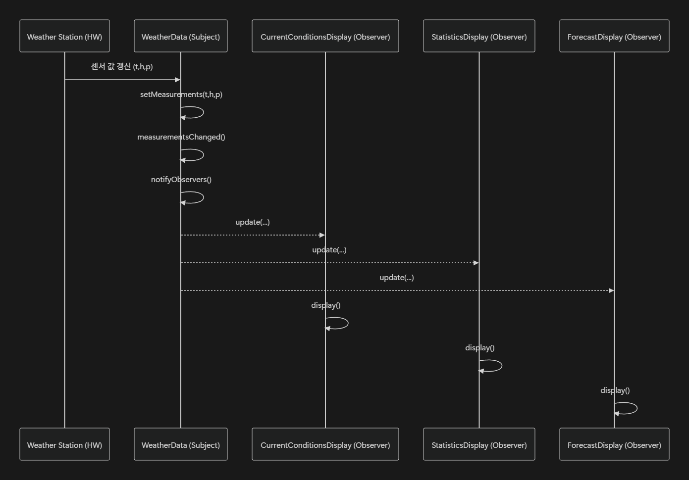 - `measurementsChanged()` → “측정값이 갱신될 때 호출되는” 콜백 메서드. 아직 비어 있음.