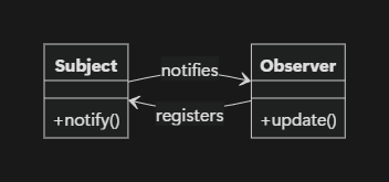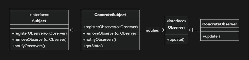 - `registerObserver()` / `removeObserver()` / `notifyObservers()`