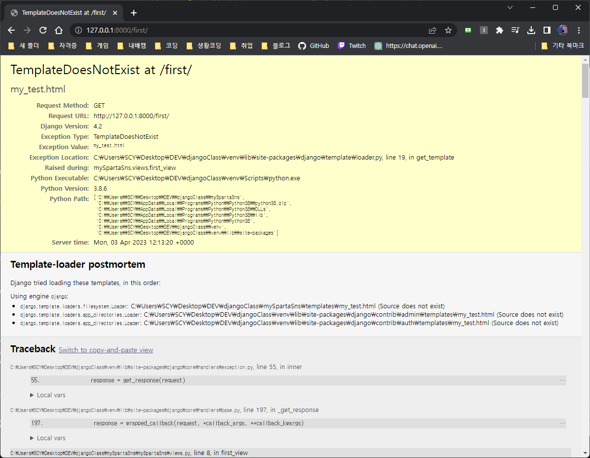 하고 다시 보니까 templates를 잘못된 위치에 만들어버렸다...